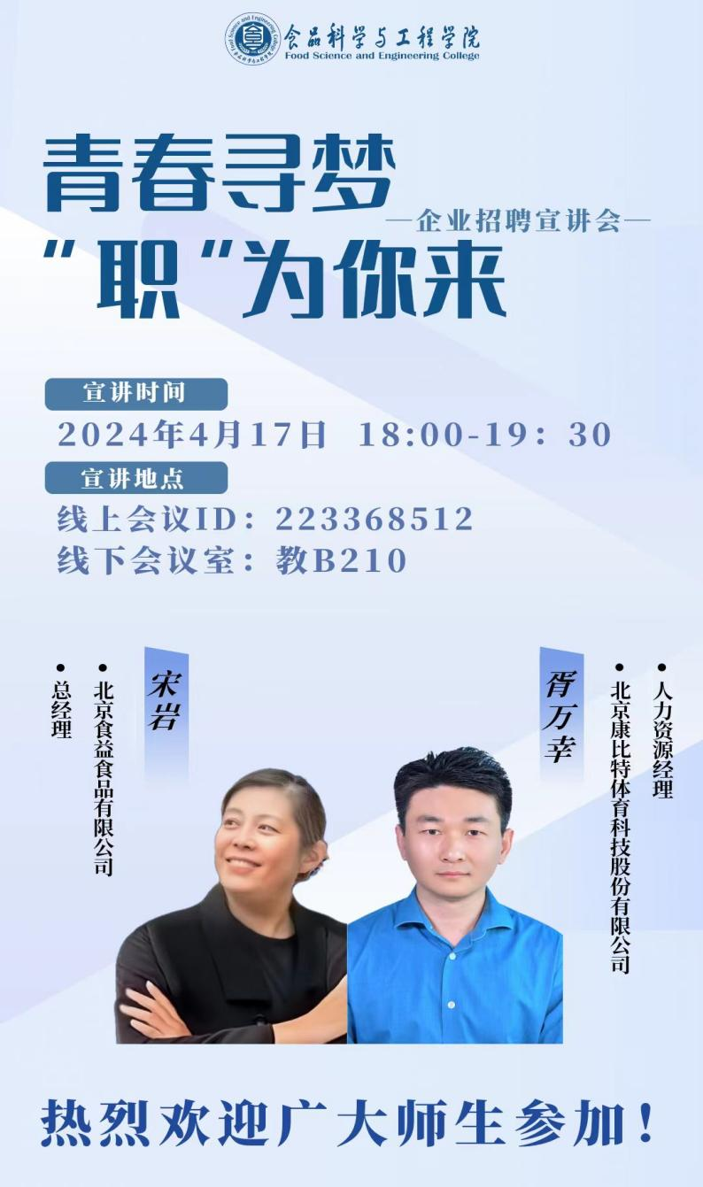 近日,太阳成集团tyc234cc举办“青春寻梦,‘职’为你来”企业招聘宣讲会,会议邀请北京食益食品有限公司和北京康比特体育科技股份有限公司两家企业到学校进行招聘宣讲活动。学院学生工作负责人闻海洋,辅导员官凌霄、杨丰瑞,学院毕业生通过线上、线下参加招聘宣讲会,会议由闻海洋主持。
